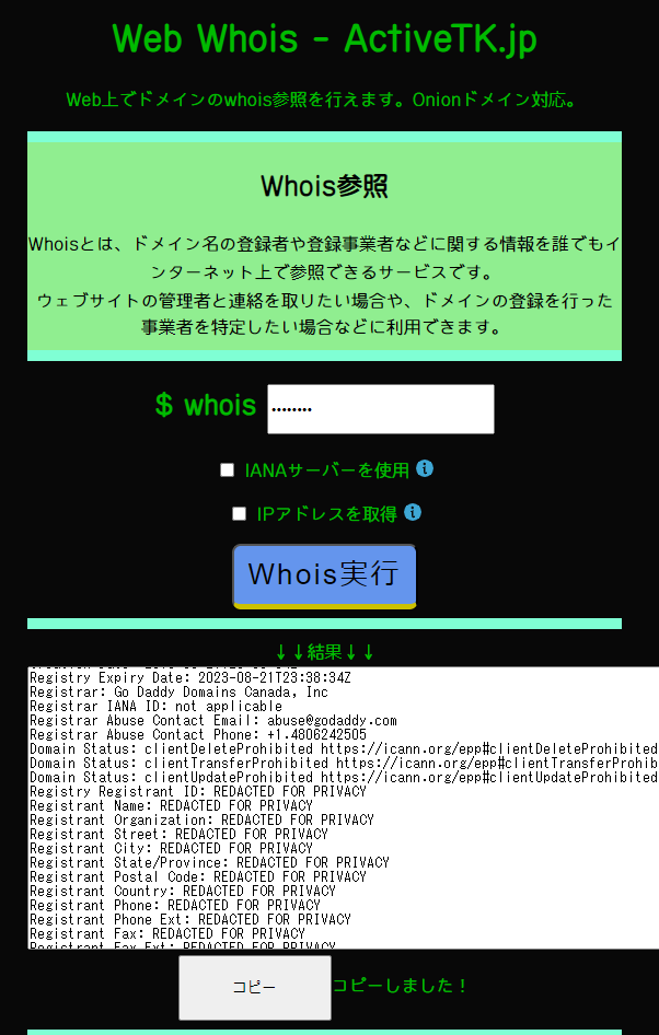上記のツールを利用すると、以下のようにWhois情報を取得できます。