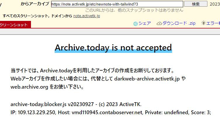 archive.todayは、しばしばサーバーのIPアドレスを変更したりドメインを移動したりするため、クローラーのIPアドレスをリスト化して拒否することは困難です。